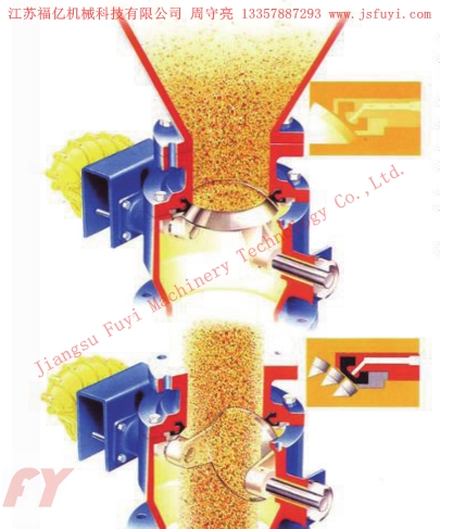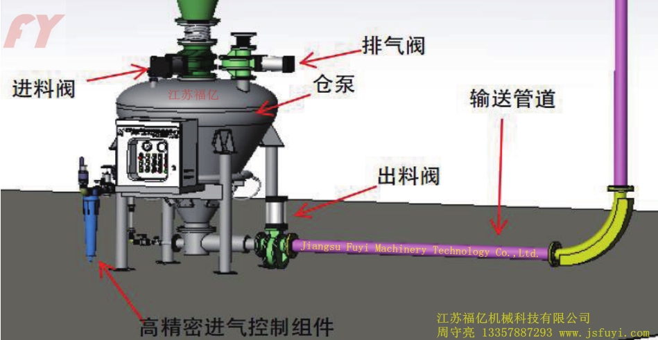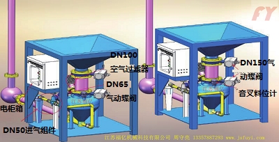 由气源来的低压空气,经调节阀(或减压阀)蝶式止回阀、活动风管、喷嘴进入泵体扩散室内,当粉状或颗粒状物料由落料斗落下进入喷嘴与扩压器之间的高速气流区时,即被吹散。加之底部气化装置的气化作用,使物料气化而成悬浮状态。此后即被高速气流送入扩压器的渐缩管内,流经喉部扩散管,进入输送管路,送至所要求的卸料点,即完成送料过程。