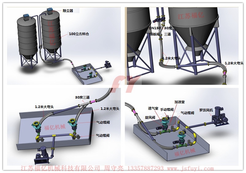 1). 稀相输送系统:该系统采用大流量微正压气体将物料悬浮提升,并以较高的流速输送,通常用于干燥和分布均匀的物料。缺点是对管道的磨损较大。